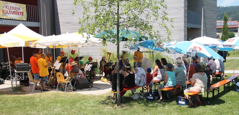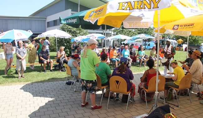 Nach der Eröffnung des Buffets und einem geselligen Beisammensein an der großen Tafel machten die 25 Musiker der Blaskapelle Lautenbach mit einer Potpourri aus ihrem Repertoire ordentlich Stimmung. Im Anschluss begeisterten die Trommler von „Akongo Percussion“ mit afrikanischer Trommelmusik die Zuschauer. Interessierte konnten anschließend an einem Trommel-Workshop teilnehmen und sich von den faszinierenden Rhythmen anstecken lassen. Auch die Band „The Crazy Skiddles“ der SKID gGmbH aus Überlingen war wieder auf der Kulturfete dabei und sorgte mit ihren rockigen Gitarrennummern für weitere Highlights des Festes. Einen gelungenen musikalischen Abschluss zauberte schließlich Dozentin Gabriele Schulze-Schilddorf mit ihrem Angebot des Offenen Chors und vielen begeisterten Mitmacherinnen und Mitmachern. Auch der Workshop „Schere in Bewegung“ von Ute Dreher war gut besucht. Hier wurde sich durch Tanzen auf die Bewegungen mit Schere und Papier eingestimmt, worauf spannende Scherenschnitte entstanden.