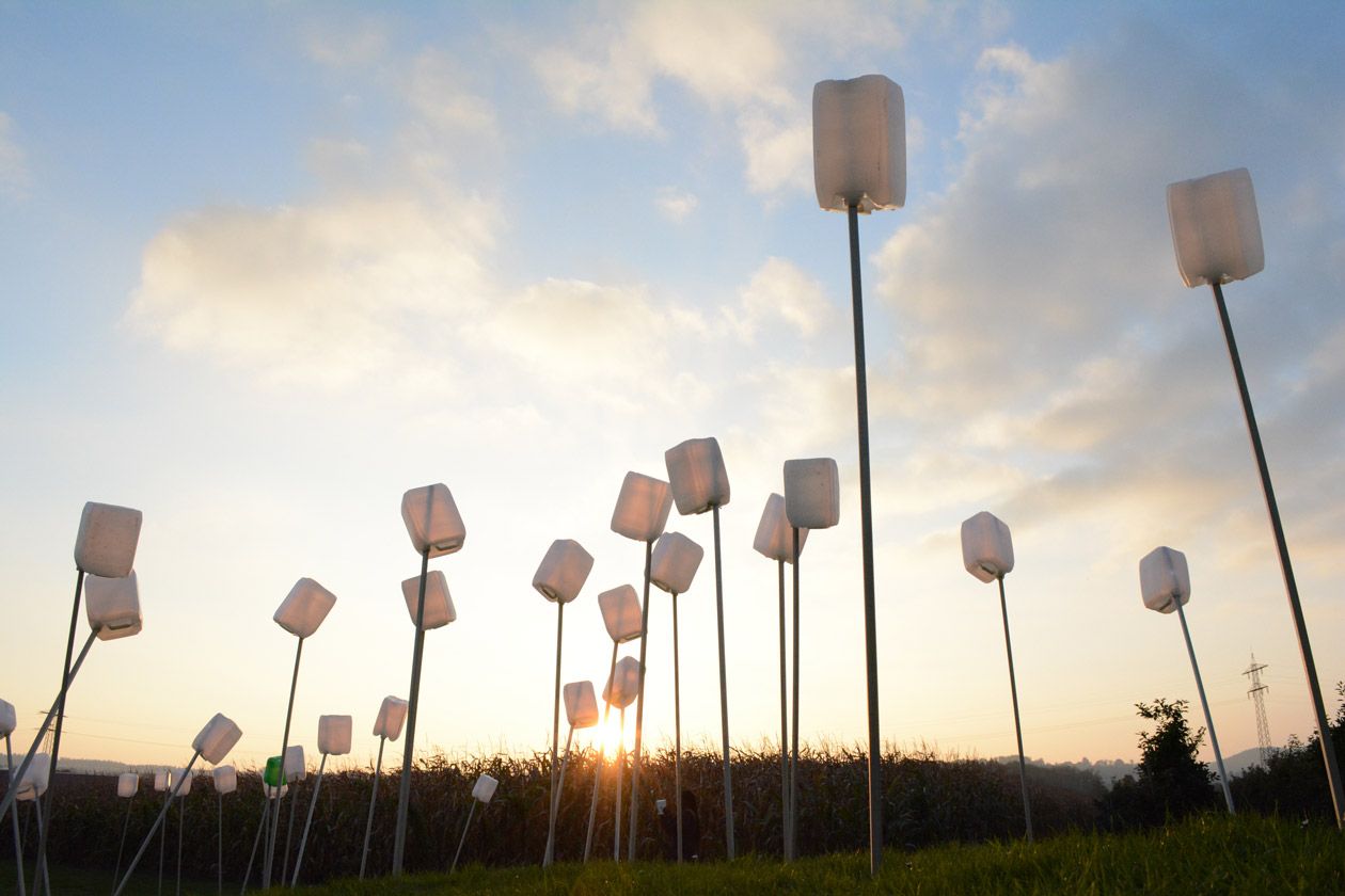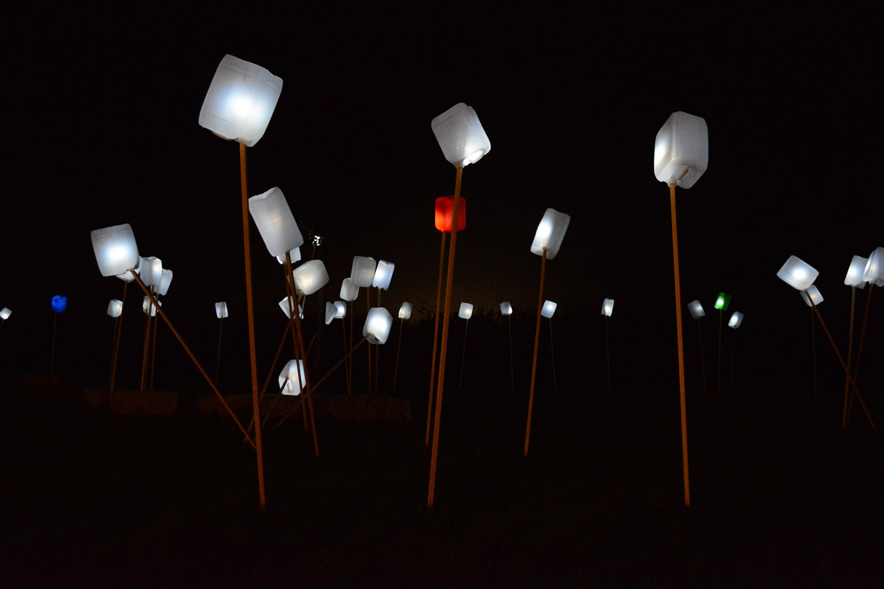 Unter dem Motto „we canister“ entstand aus recycelten 10L-Plastikkanistern eine Leuchtwolke. Die Kanister wurden einzeln mit einem batteriebetriebenen Leuchtmittel auf einer Holzstange aufgestellt und in der freien Landschaft platziert.